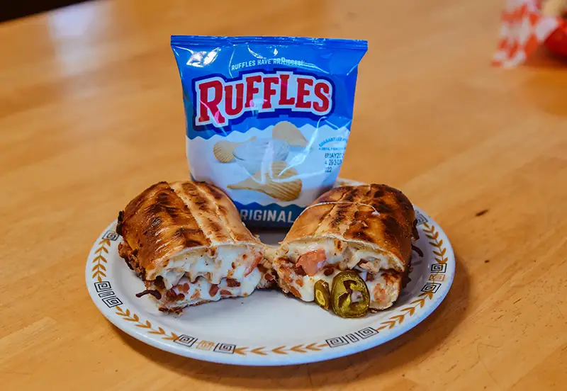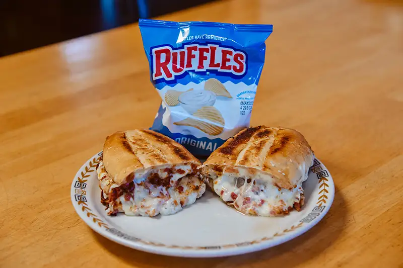 Get ready for a flavor explosion! Garlic butter, seasoned chicken, bacon, tomato, jalapeños, and mozzarella come together on toasted French bread. If you like things spicy, this one’s for you. And, of course, it comes with chips!