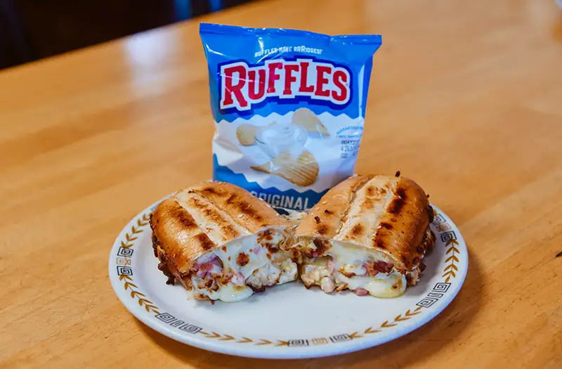 Simple, classic, and oh-so-satisfying - ham, mozzarella, and cheddar cheese create a comforting combo that never goes out of style. Served with chips for that perfect bite.