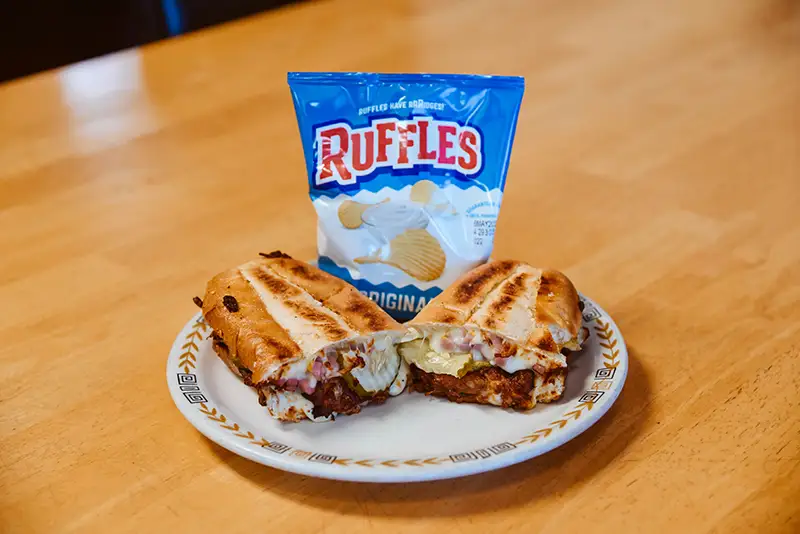 A little sweet, a little tangy - ham, seasoned pulled pork, pickles, mustard, and mozzarella are all packed into one delicious sub. It’s like a Cuban sandwich, but better. And yes, it comes with chips!