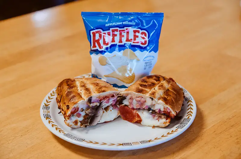 A meaty masterpiece with pepperoni, ham, sausage, mushrooms, onions, and gooey mozzarella. It’s everything you love in a Stromboli, tucked inside warm, toasted French bread. Plus, it comes with chips to make it complete!